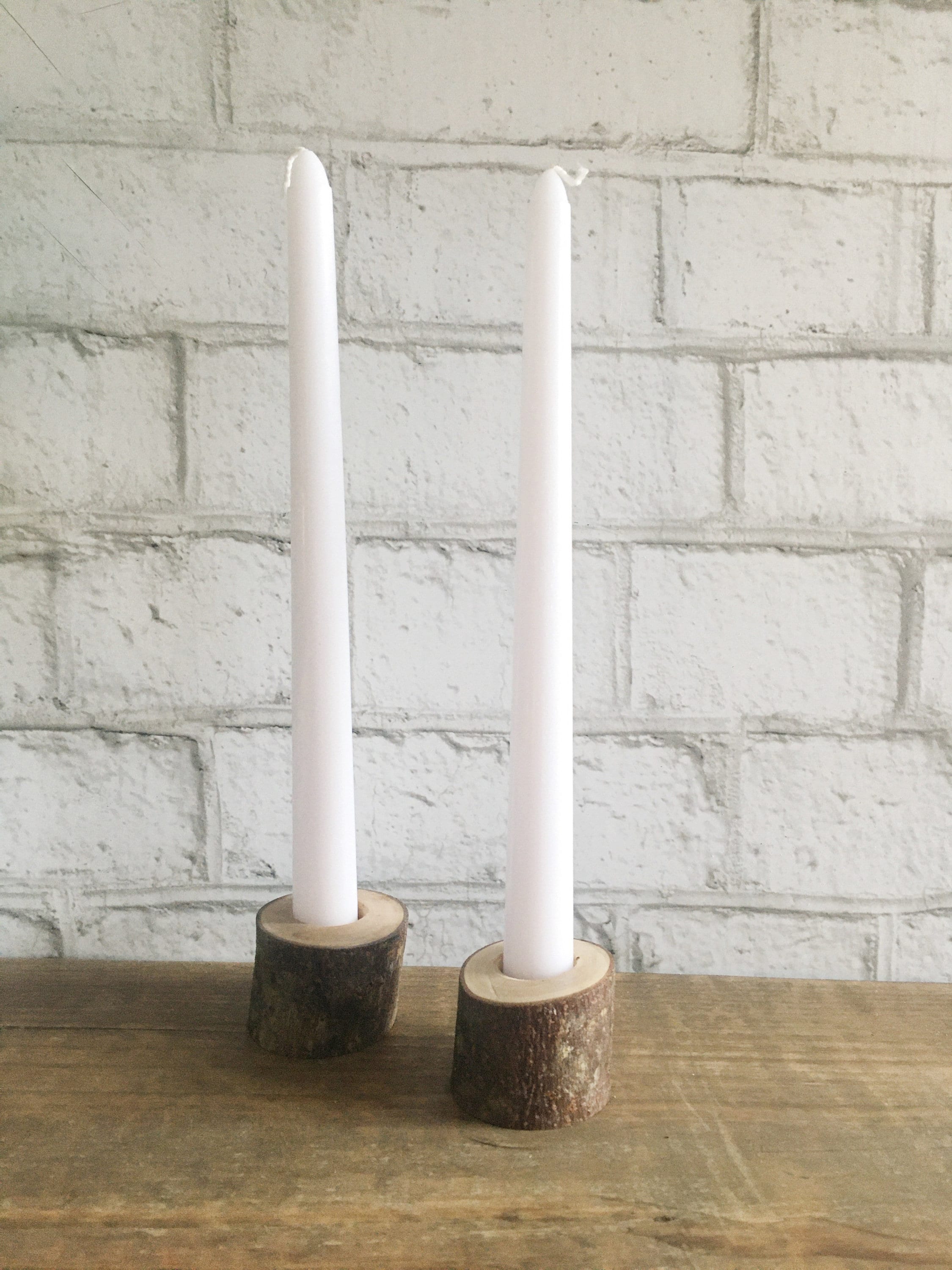 This listing is for a set of 2 natural wood log candlestick holders in white, natural or gold. These are REAL, NATURAL wood candle pillars from the beautiful woods of North Carolina. They are sized approximately 1-2" tall and 1-2" wide. Due to the handmade, rustic nature, there will be some slight variations in color, bark and size.